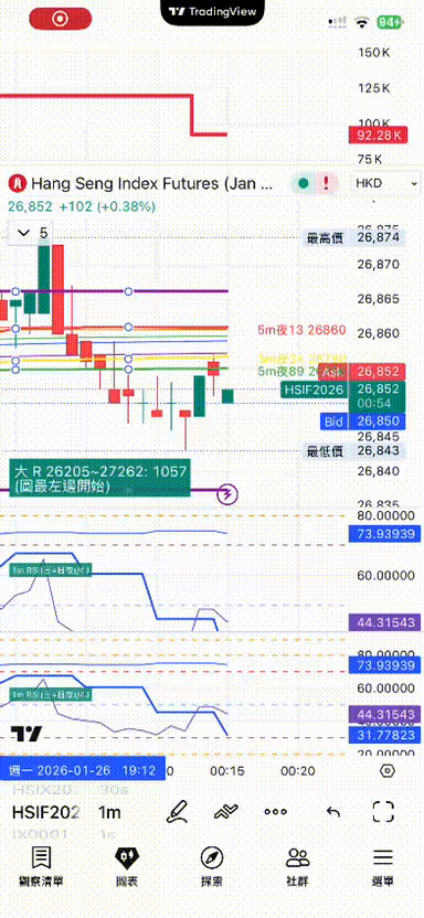 暫時測試是只支援電腦版, TradingView 不支援手機版 HSI 日內數據, 我懷疑它忘記了封電腦版, 有得用就用住先 😂 😂 手機版打開了這個功能會顯示 "Unsupported resolution" error, 關了這個功能就會回復正常