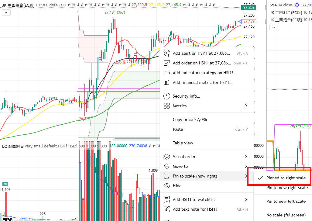 1. 「主圖組合2」通常是日線圖用的, 分鐘圖不需要「主圖組合2」,按一下「主圖組合2」然後按 「X」刪除 「主圖組合2」。 2. TradingView 預設的 Vol 不太好用,刪除預設的 Vol, 加多一個獨立顯示 Vol 的「副圖指標」, 只是開「顯示 Vol」和「顯示 過往同分鐘的獨立 Vol平均」,關掉其他。 3. 「主圖」太大,「副圖」太細,按「主圖」與「副圖」之間的分界線,拉上去,放大副圖。 4. 有的同學沒有設定「大R 」的開始時間或者設定錯了日期,這幅圖打錯了2033年。大家可以在「主圖組合」內的設定日期,多數是上月的結算日。 5. 主圖太偏,可以看「圖太偏」常見問題解決。 6. 右面 Y-AXIS 太多數字,可以看「右邊 Y-AXIS 太多數字」常見問題解決。 |